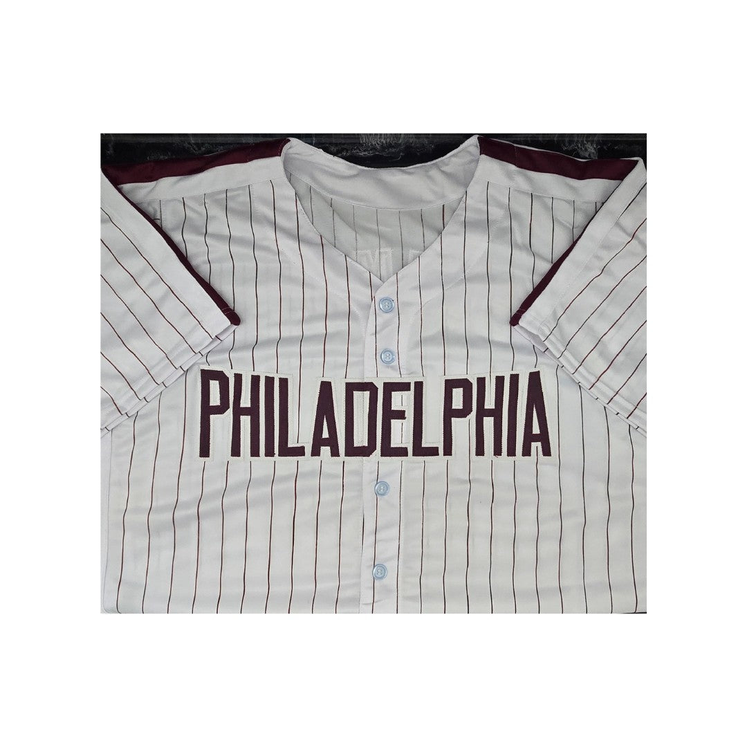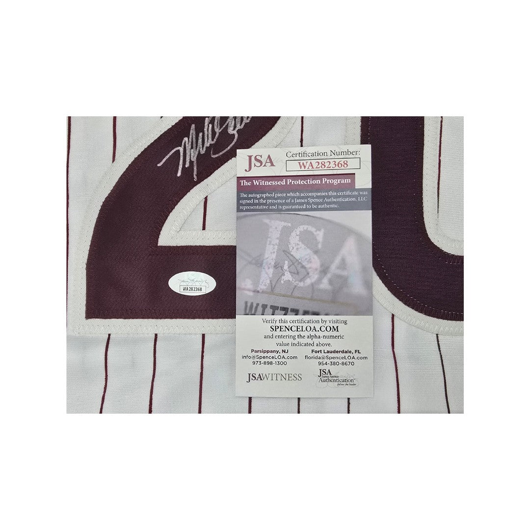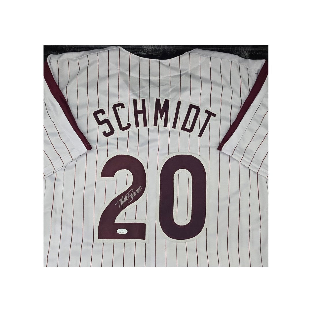 This is an autographed baseball jersey featuring the iconic Mike Schmidt, a legendary player for the Philadelphia Phillies, known for his impressive career and significant contributions to the game. The jersey is designed with the classic pinstriped pattern that is synonymous with the Phillies' uniform, making it a stylish piece for any fan or collector. It comes with a Certificate of Authenticity from JSA (James Spence Authentication), ensuring that the signature is genuine and adding value to this collectible item. Whether displayed in a sports memorabilia collection or worn to a game, this jersey not only represents a piece of baseball history but also serves as a tribute to one of the sport's greatest third basemen.