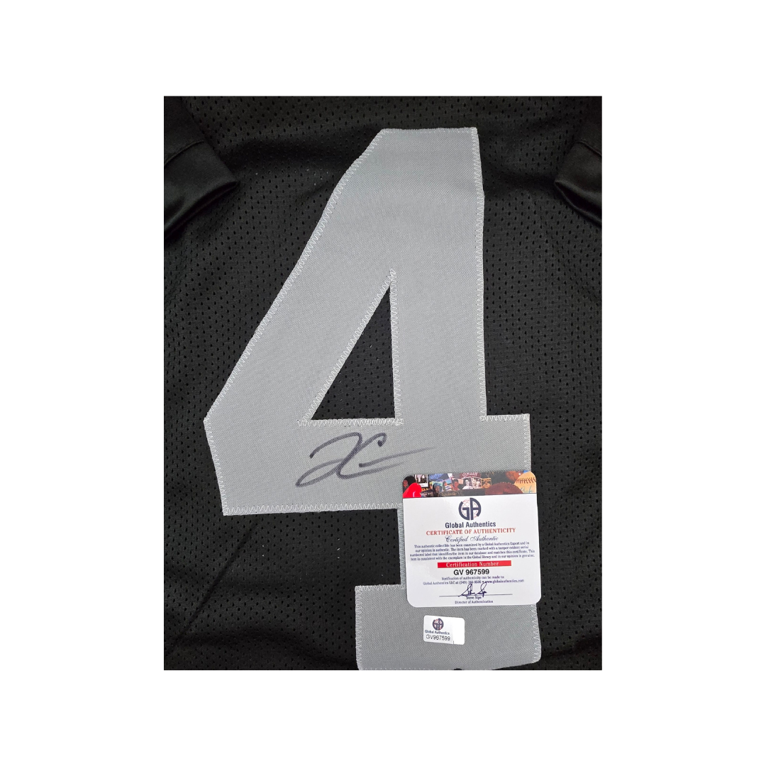 This is a remarkable opportunity for fans of the Los Angeles Raiders to own a piece of memorabilia that truly stands out: an autographed black football jersey of Derek Carr. This jersey not only showcases Carr's signature, adding a personal touch that enhances its value, but it also features the iconic black color that represents the team's fierce spirit and tradition. The jersey comes with a Certificate of Authenticity (COA), ensuring that the autograph is genuine and providing peace of mind for collectors. Whether you plan to display it in a dedicated sports room, wear it to a game, or add it to your collection, this jersey is a fantastic way to celebrate Carr's contributions to the team and the sport. It's a must-have for any true Raiders fan looking to commemorate their favorite player in style.