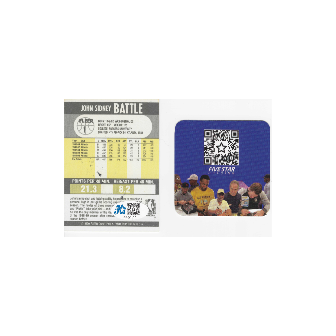 This is an authentic 1990 Fleer John Battle autographed trading card, a remarkable piece for collectors and fans alike. The card features a high-quality image of John Battle, a notable player from the era, showcasing his dynamic presence on the court. The signature is prominently displayed, adding a personal touch that enhances its value and appeal. This particular card is not only a testament to Battle's career but also a nostalgic reminder of the 1990s basketball scene. Its condition is excellent, with minimal wear, making it a desirable addition to any sports memorabilia collection. Whether you are a seasoned collector or a newcomer to the hobby, this autographed card represents a unique opportunity to own a piece of basketball history.