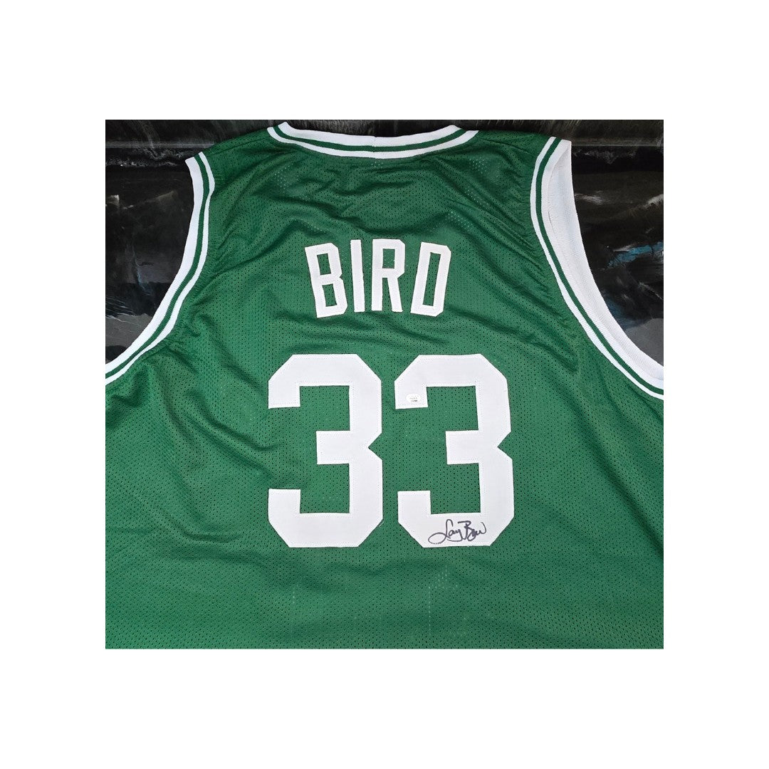 This is a Boston Celtics basketball jersey that has been personally signed by the legendary Larry Bird, one of the most iconic players in NBA history. The jersey features the classic green and white colors of the Celtics, adorned with Bird's name and number, 33, which fans recognize instantly. The autograph is a unique addition, making this piece not just a sports item but also a collector's treasure. It comes with a certificate of authenticity, ensuring that the signature is genuine and adding to its value. Whether displayed in a sports memorabilia collection or worn during a game, this jersey represents a piece of basketball history and the legacy of a player who defined excellence on the court.