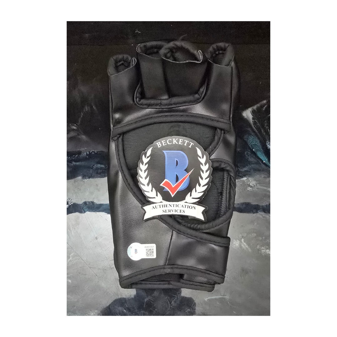 This is a signed black fighting glove from Francis Ngannou, a prominent figure in the UFC and MMA world. The glove comes with a Beckett Authentication Services (BAS) certificate of authenticity, ensuring that it is a genuine piece of memorabilia. Ngannou, known for his incredible strength and striking ability, has made a significant impact in the sport, and this glove represents a piece of his legacy. Collectors and fans alike will appreciate the value of owning an item that has been personally signed by the fighter, making it a unique addition to any sports memorabilia collection. The glove not only serves as a reminder of Ngannou's achievements in the octagon but also as a testament to the excitement and passion that MMA brings to its fans.