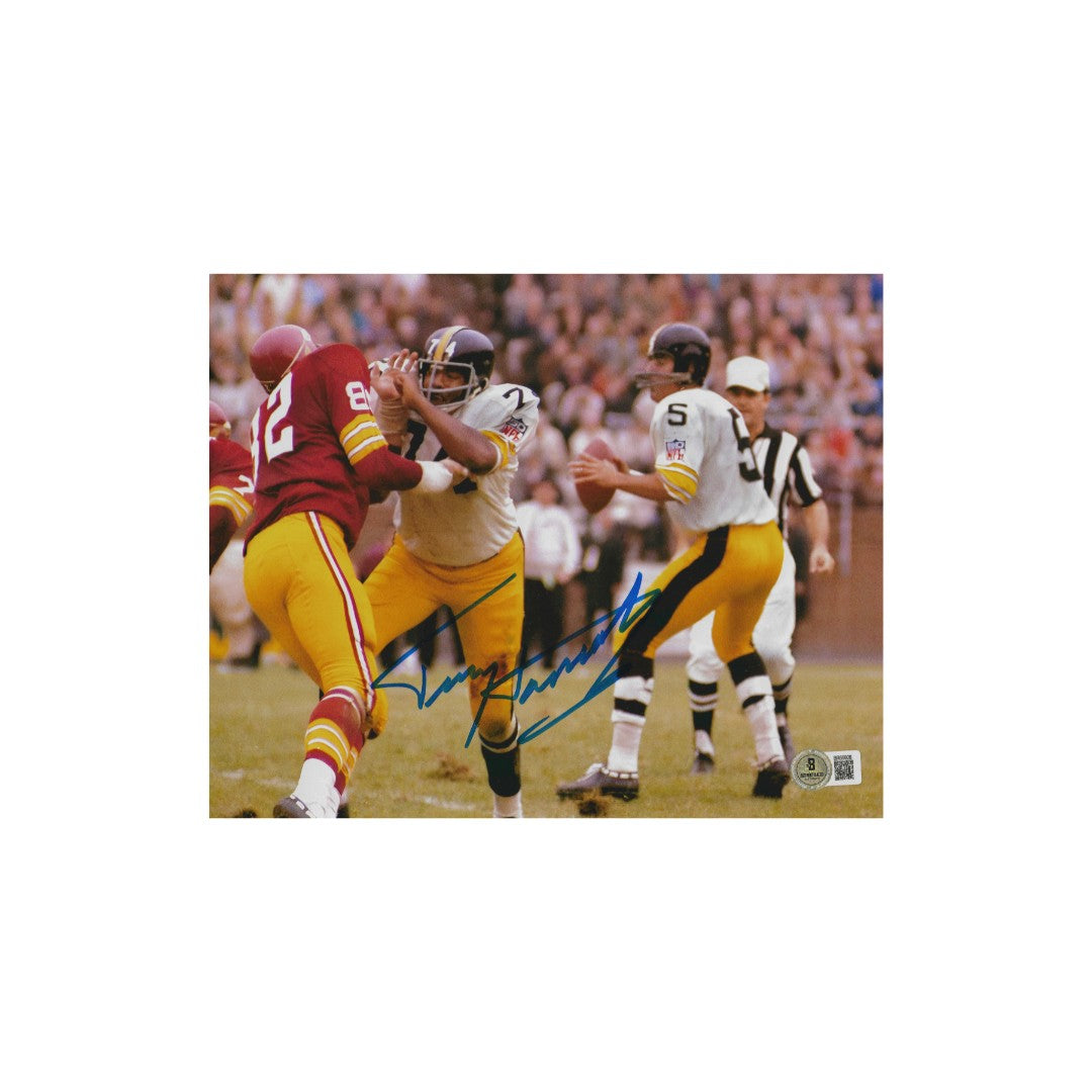Terry Hanratty, a notable figure in Pittsburgh Steelers history, has left his mark not only on the field but also in the memorabilia world. This particular item is an autographed 8x10 photo of Hanratty, capturing a moment from his time with the Steelers, a team renowned for its rich legacy in the NFL. The photograph is accompanied by a hologram, which serves as a guarantee of authenticity, ensuring that collectors can trust the signature is genuine. Hanratty, who played as a quarterback during the late 1960s and early 1970s, contributed significantly to the team's success, making this signed photo a valuable piece for fans and collectors alike. Whether displayed in a personal collection or given as a gift, this autographed photo is a tribute to Hanratty's enduring legacy in Pittsburgh sports history.