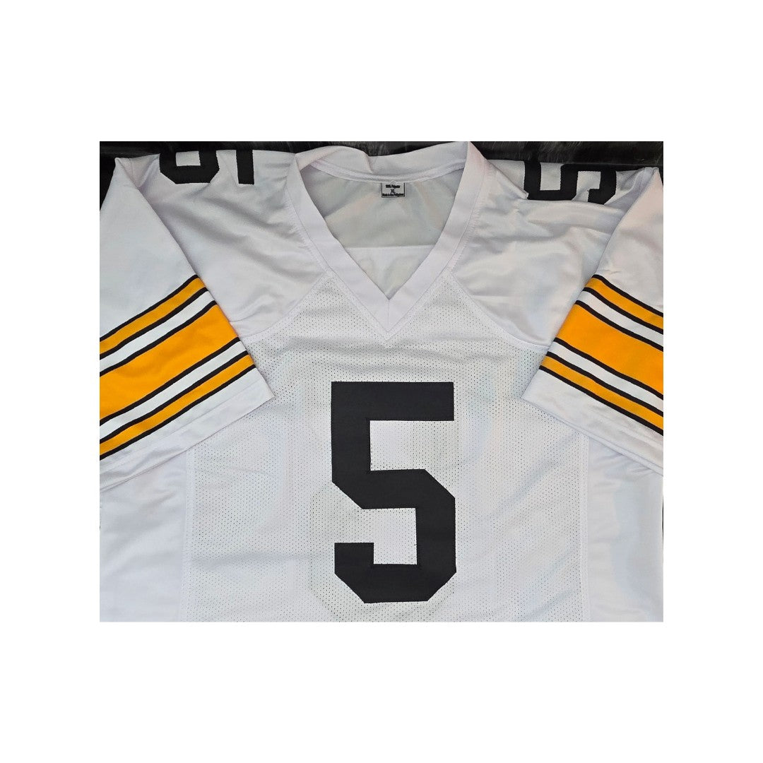 This is a Pittsburgh Steelers home football jersey that has been personally autographed by the legendary Terry Hanratty, a notable figure in the team's history. The jersey comes with a certificate of authenticity (coa), ensuring that the signature is genuine and adding value to this collectible item. Hanratty, who played as a quarterback for the Steelers during the late 1960s and early 1970s, was part of the team during a pivotal time, contributing to their early successes. This jersey not only represents a piece of sports memorabilia but also serves as a tribute to Hanratty's legacy and the rich history of the Steelers franchise. Whether you're a dedicated fan or a collector of sports memorabilia, this autographed jersey is a fantastic addition that showcases both team pride and appreciation for a significant player in NFL history.