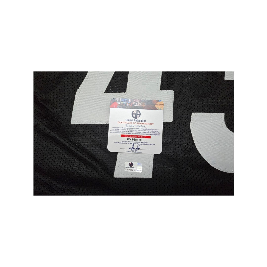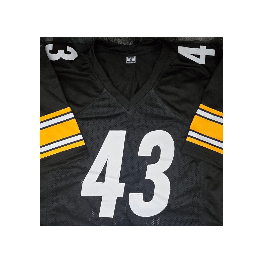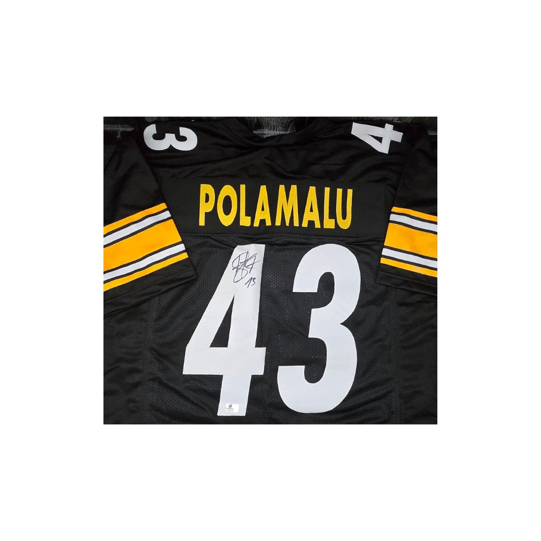 This is a custom football jersey featuring the signature of Troy Polamalu, the legendary safety of the Pittsburgh Steelers. The jersey is not only a tribute to Polamalu's remarkable career but also a collector's item, complete with a certificate of authenticity (COA) to verify its legitimacy. Crafted with high-quality materials, the jersey showcases the iconic black and gold colors of the Steelers, making it a perfect addition for any fan or memorabilia enthusiast. Whether displayed in a collection or worn during game day, this autographed jersey serves as a lasting reminder of Polamalu's impact on the sport and his unforgettable moments on the field.